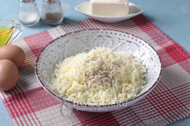 Сыр сулугуни вынуть из упаковки и натереть на тёрке. По вкусу сыр достаточно солёный, поэтому соль можно не добавлять. А вот молотого перца добавить не помешает.